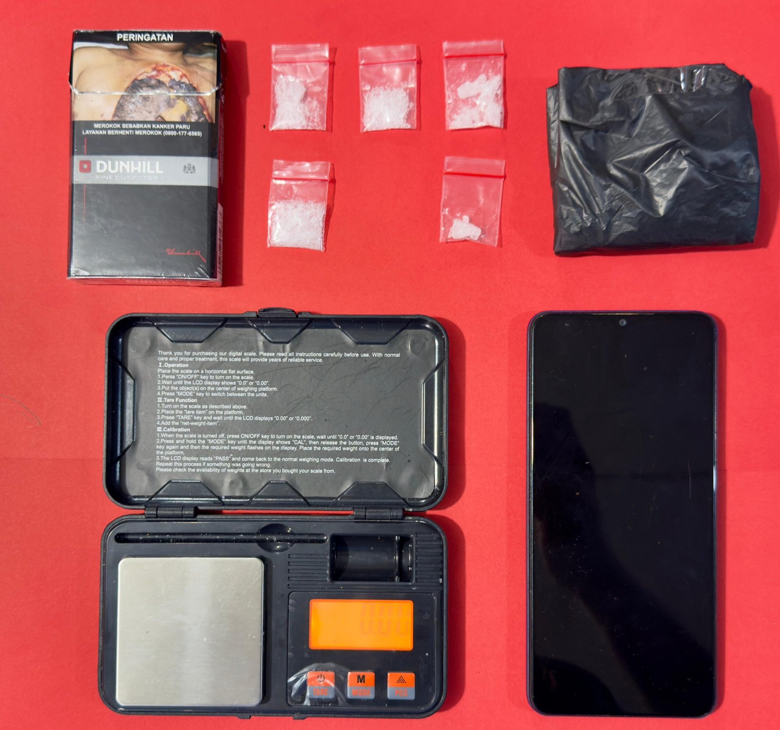 Selain narkotika, polisi juga menyita sejumlah barang lain yang berkaitan antara lain satu unit telepon genggam, timbangan digital, bungkus rokok, serta kantong plastik berwarna hitam. Seluruh barang bukti kemudian diamankan bersama pelaku ke Mapolres Sanggau untuk pemeriksaan lebih lanjut.